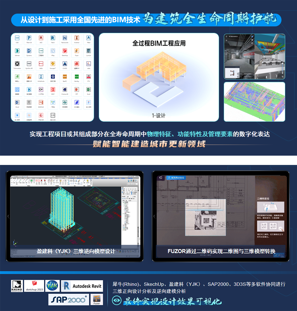 设计方面:公司采用犀牛(Rhino)、SkechUp、盈建科(YJK)、SAP2000、3D3S等多软件协同进行三维正向设计分析及逆向建模分析,最终实现设计效果可视化。